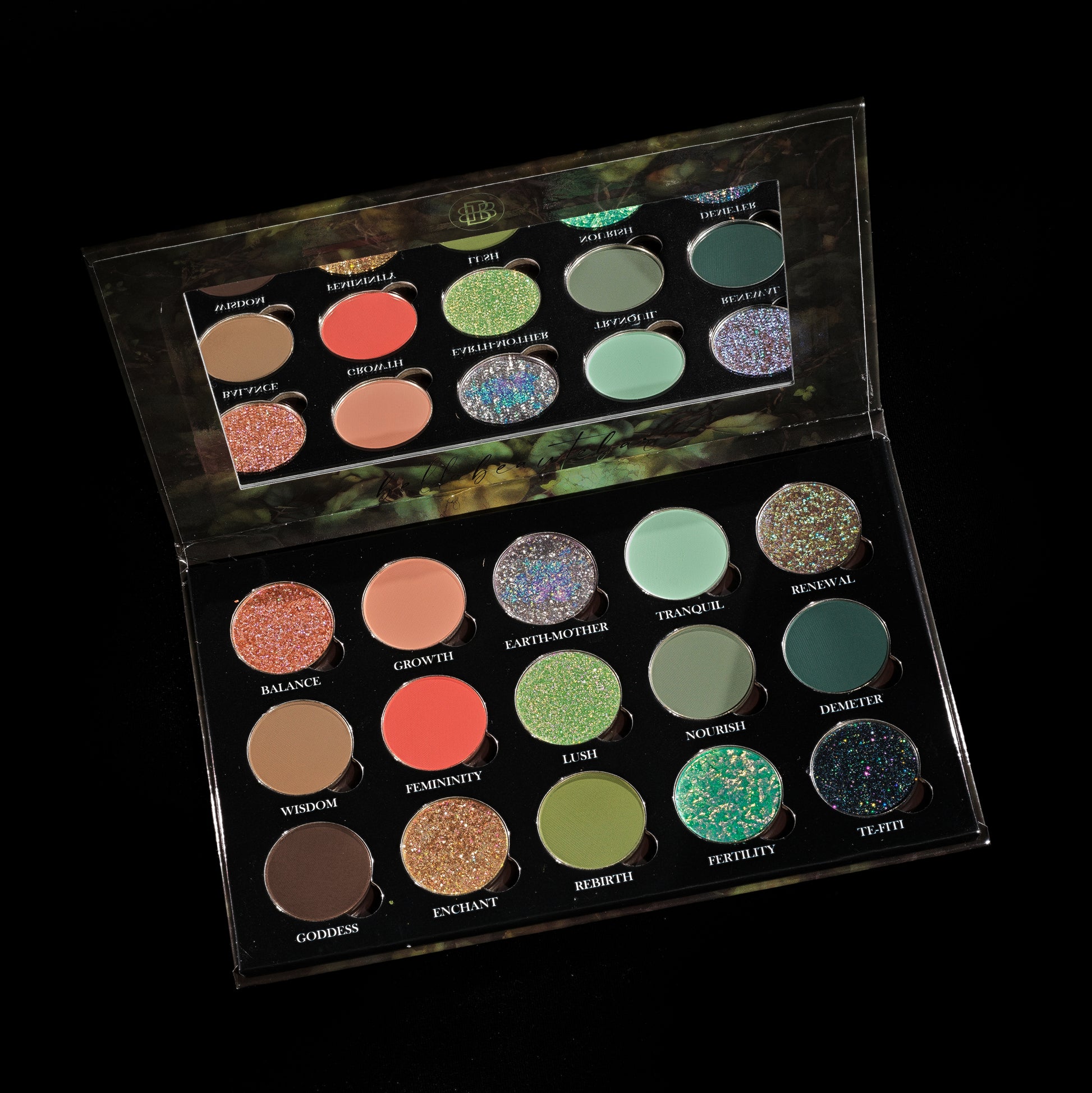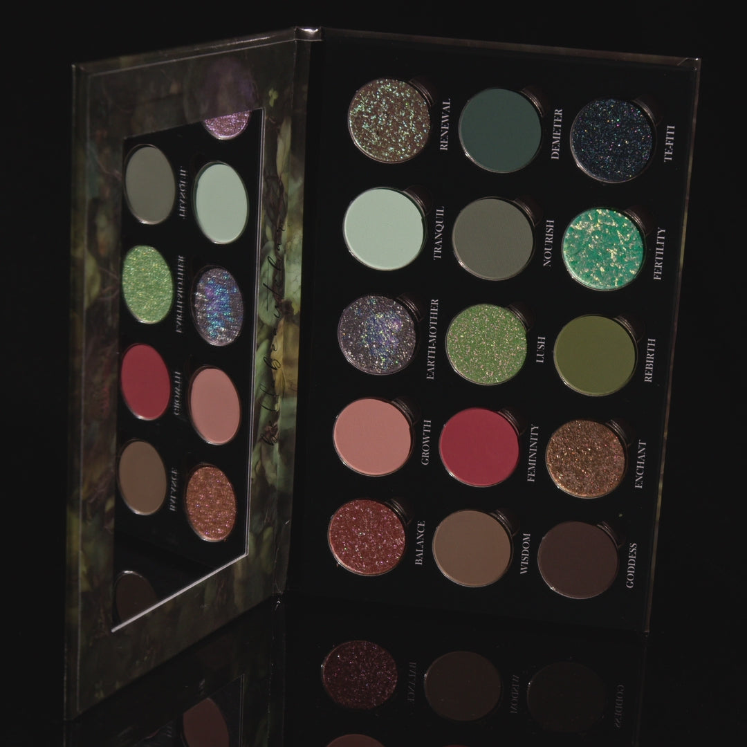 Greens, earthy browns and muted reds: this nature-inspired palette features seven unique multichrome shimmers and eight buttery mattes.
