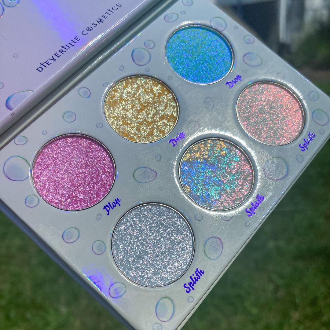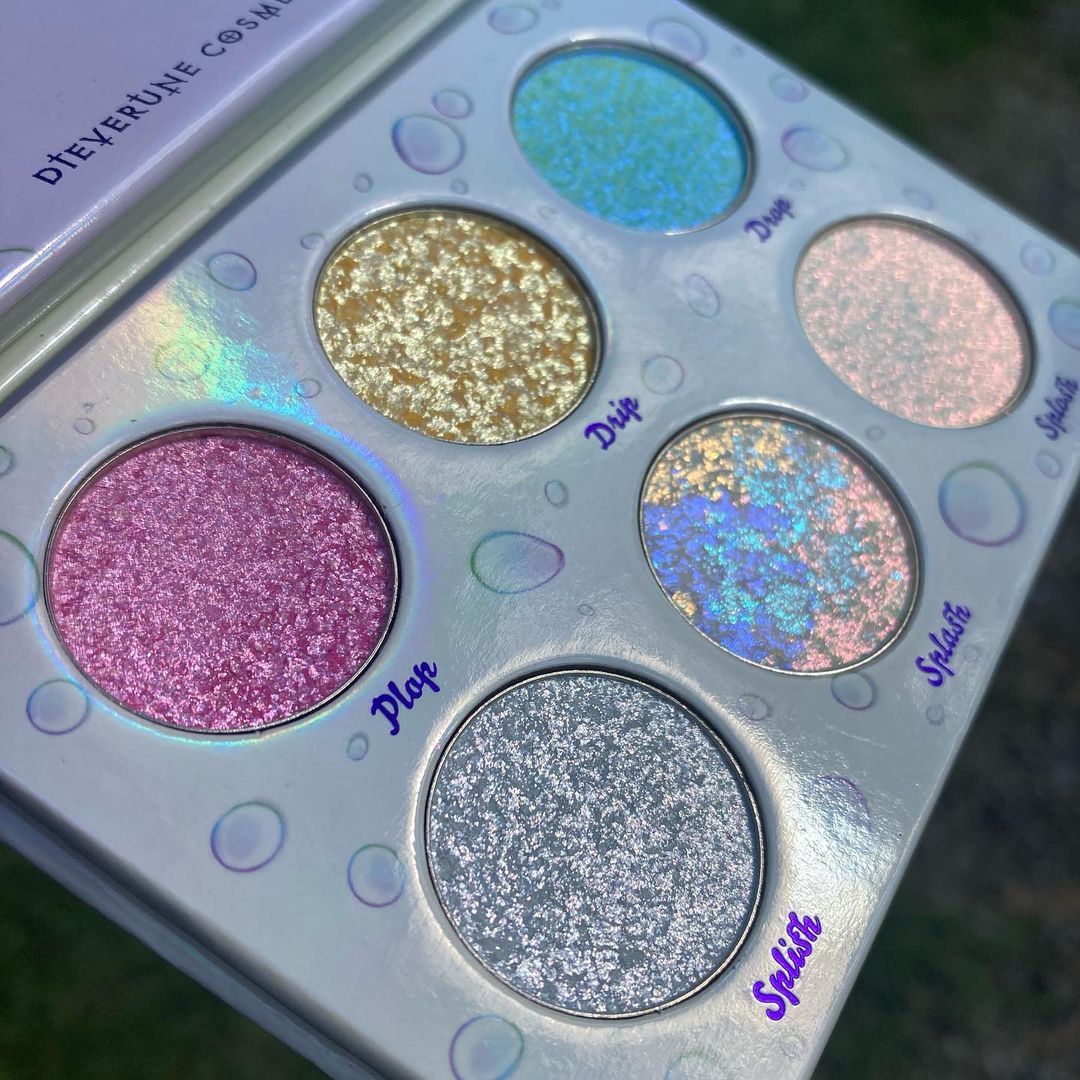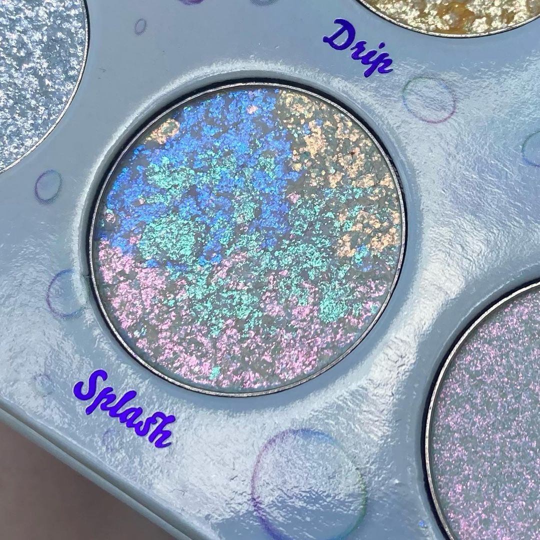 The Dewdrops palette is made to be used for eyeshadow or highlight. It features six sparkly iridescent multichromes. A special rainbow explosion shade, SPLASH, can be worn mixed or not.