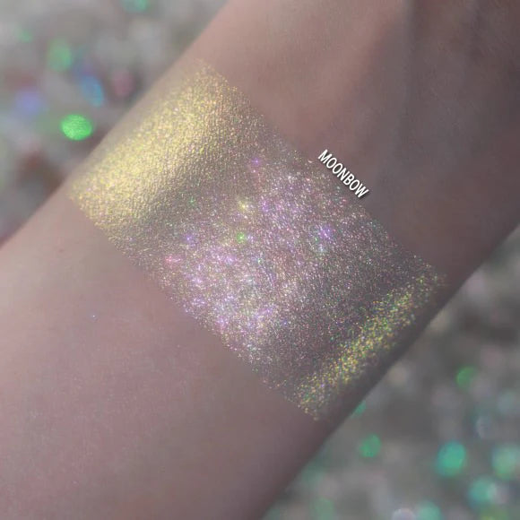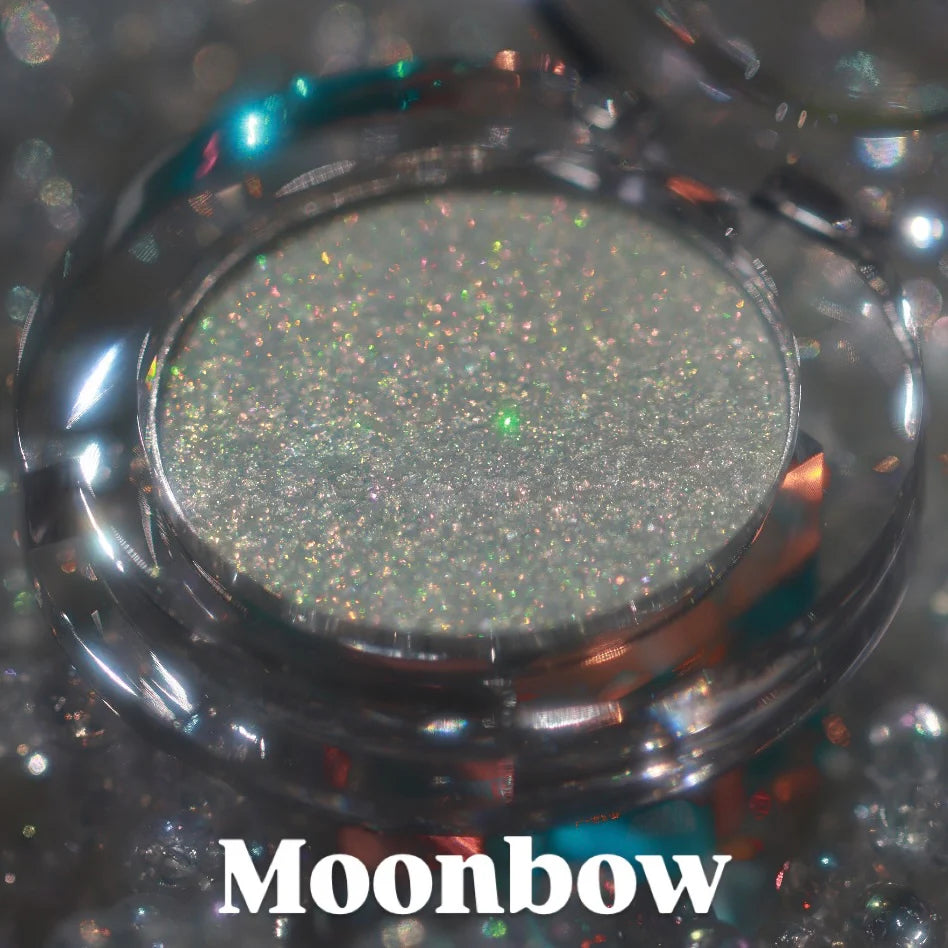 - Moonbow: A mix of pink, orange, gold and green sparkles in an iridescent base. Super sparkly, warmer-toned and shifty.