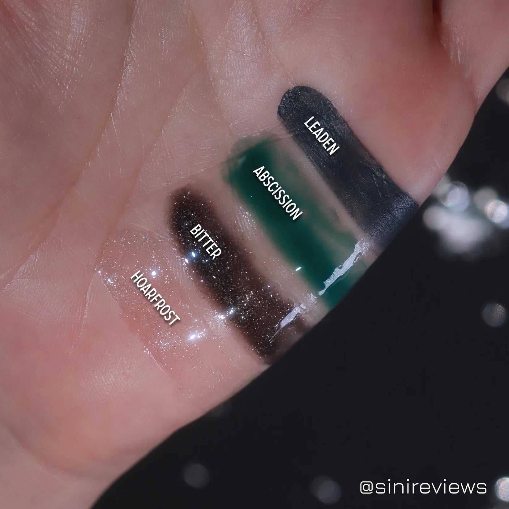 - Bitter Gloomy lip gloss: A sheer black base full of silvery white sparkle. Despite how sparkly it looks, it still feels extremely smooth on the lips.