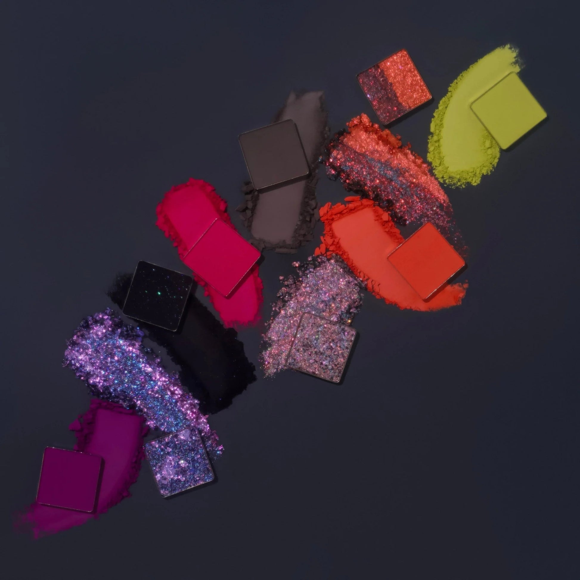 Inspired by late-night glam rituals, this 9-pan curation includes three unique high-impact multichromes: a split-pan, a rainbow holo, and a marbled shade to deliver multidimensional shifts. Six bold, blendable mattes vary from electric brights to moody darks.