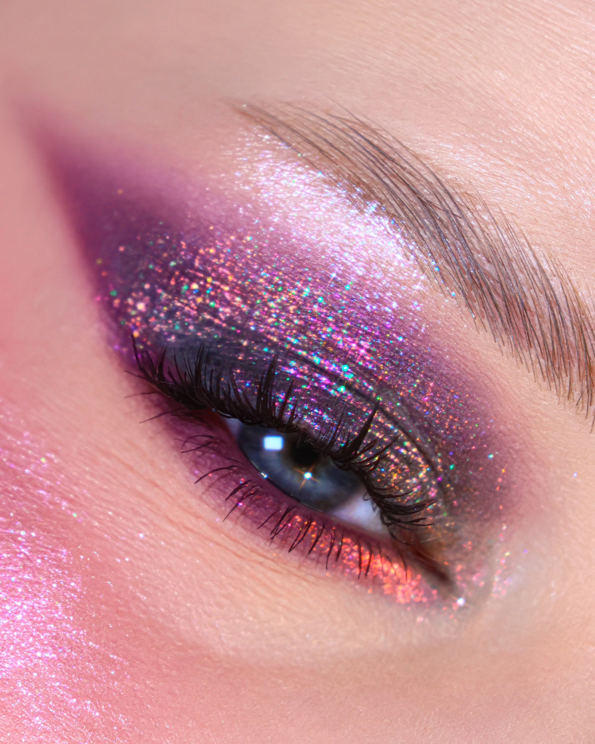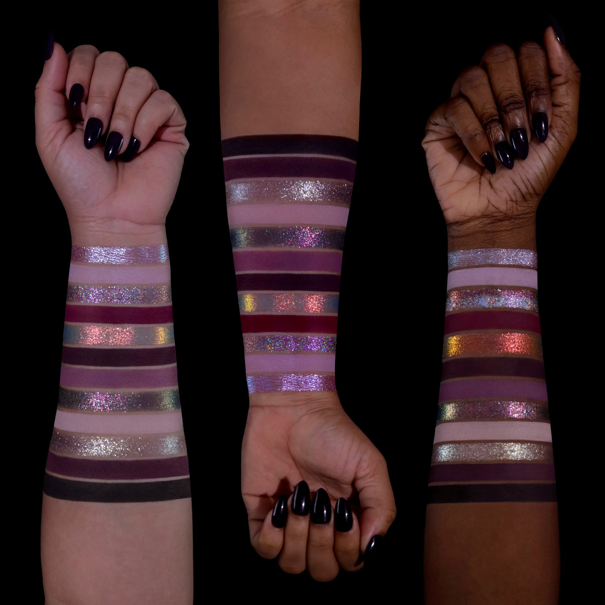 Dark romance of muted mauves, deep wines, charcoal tones, antique neutrals, and prismatic shimmer, designed for smoky eyes, soft gothic glam, romantic editorial looks, and multidimensional artistry.