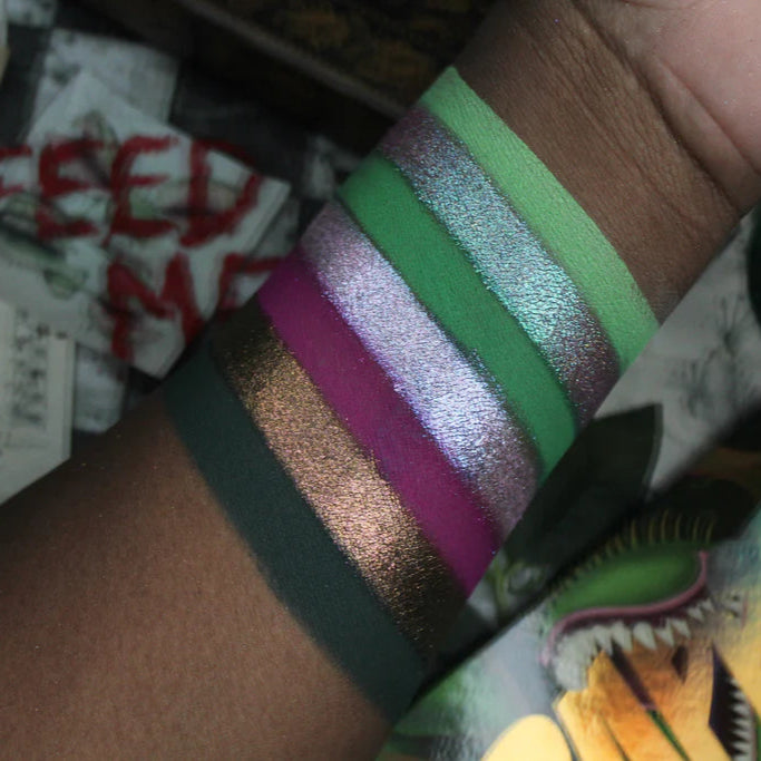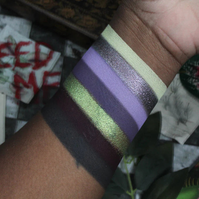 The prequel to Gourmande Girls' bestselling Spooked and Nightshade palettes: the origin of something deeper, darker, and far more monstrous. A green-and-purple colour story mixing deep and pastel shades for moody looks, intertwining beauty and horror.