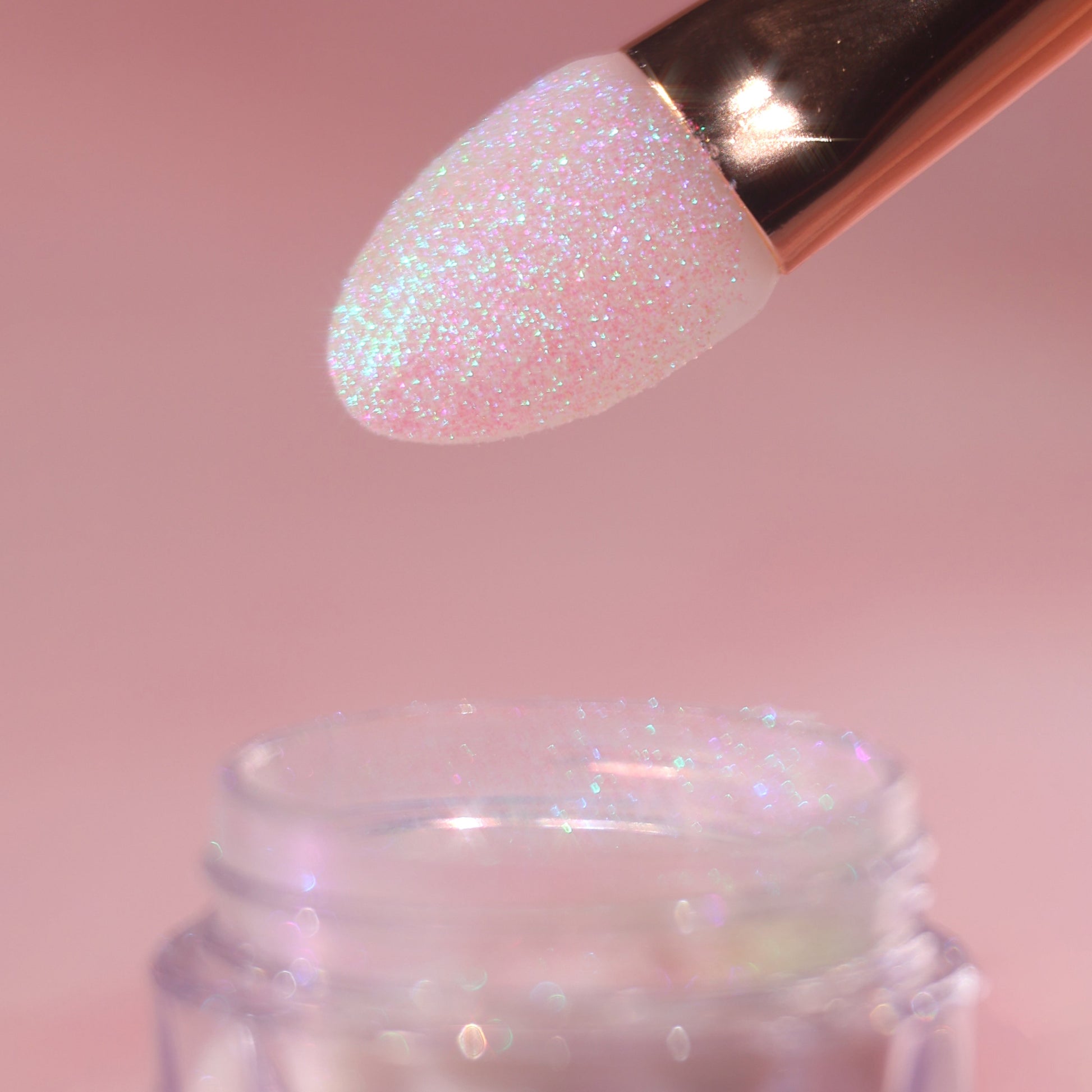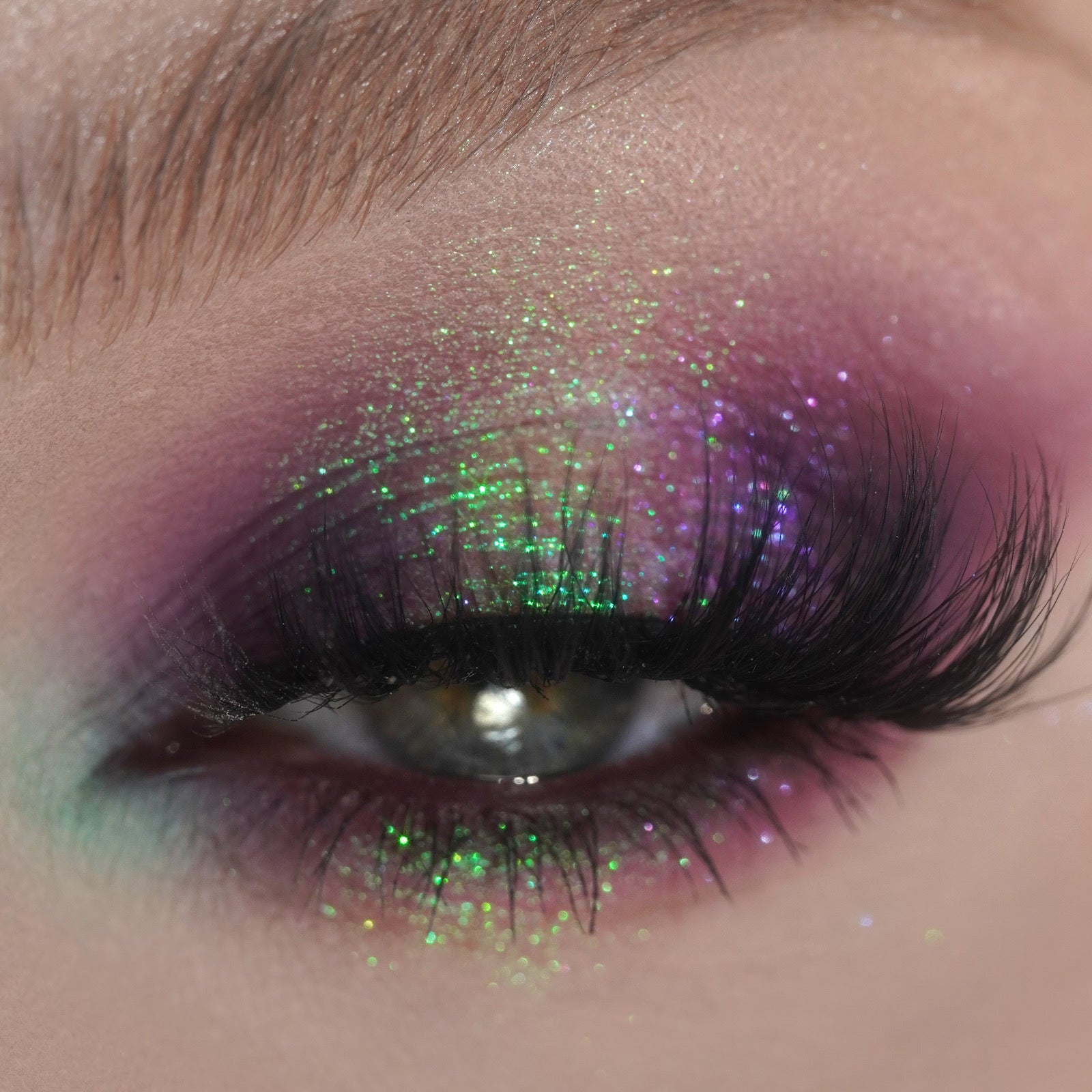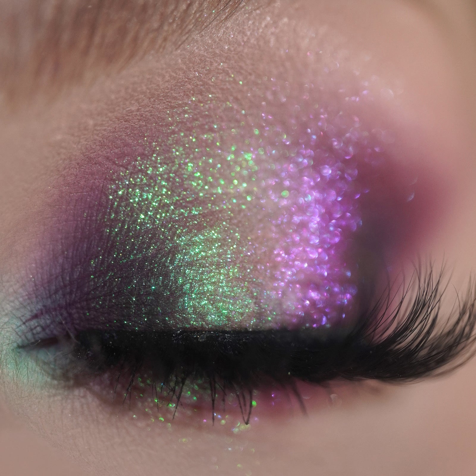 Super-fine loose eyeshadows with a pastel base and a glimmering, colour-changing finish, designed to complement all skin tones. With a body colour of translucent shimmer and sparkles, it shifts spectral colours: whispering mint, mystical blue violet, and blushing pink.
