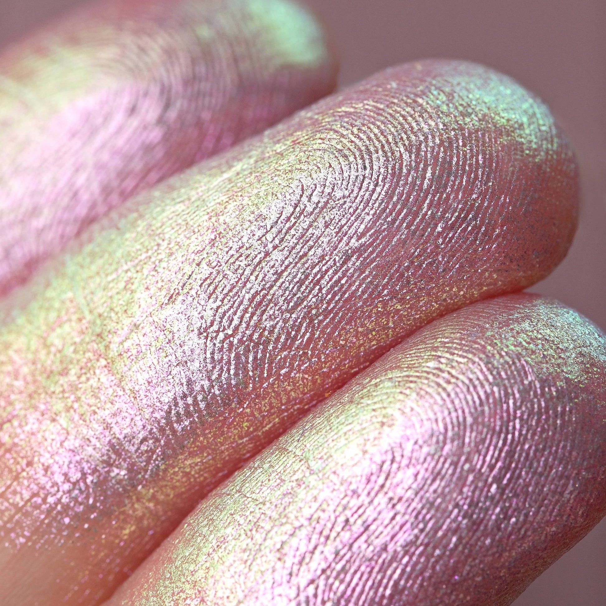 Super-fine loose eyeshadows with a pastel base and a glimmering, colour-changing finish, designed to complement all skin tones. Shifts from moonlit silver to rosebud blush and to enchanted forest.