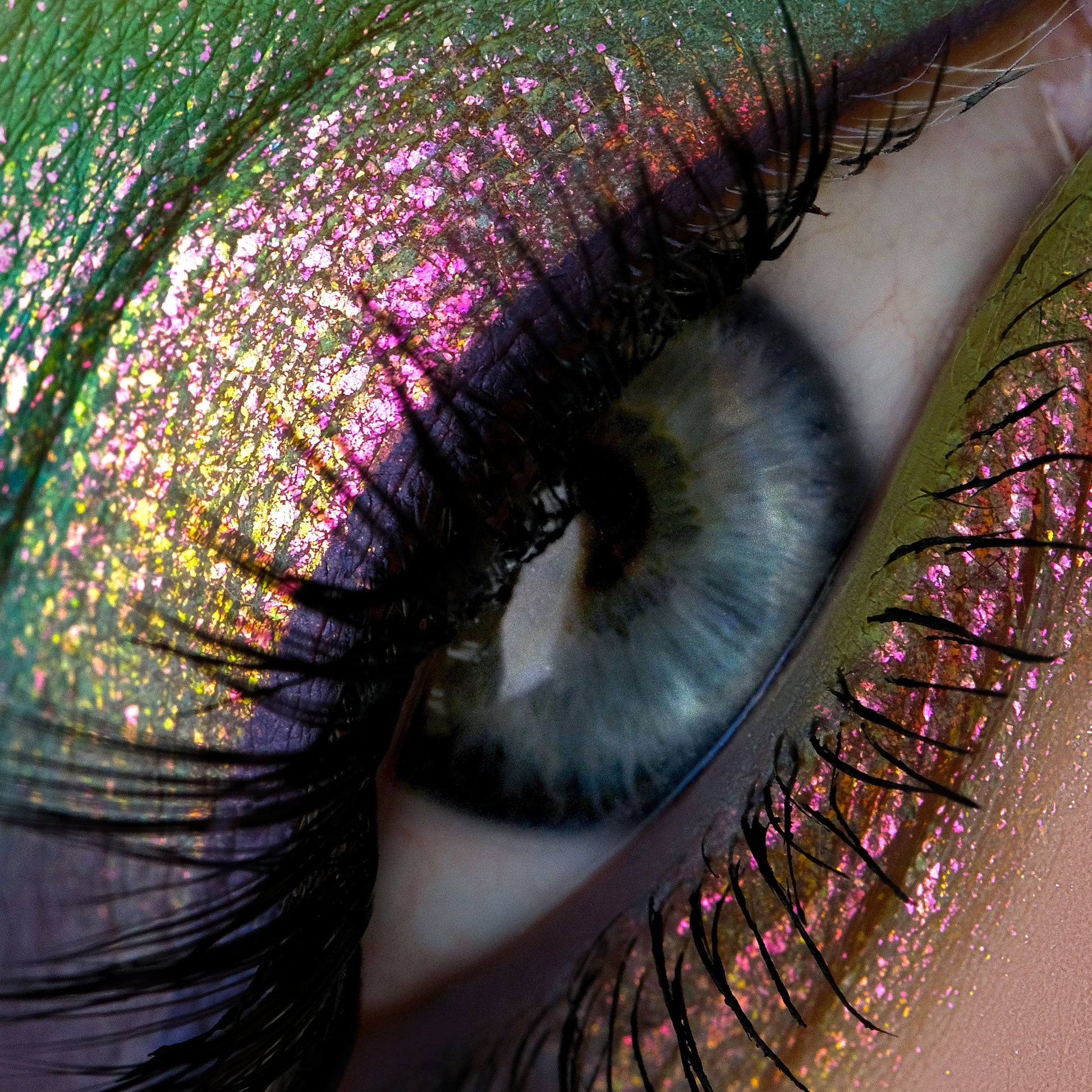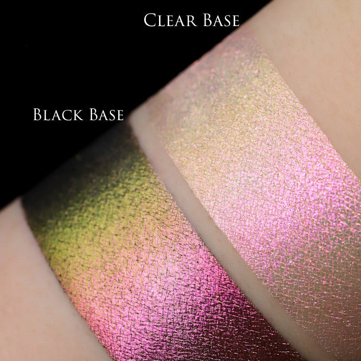 Super-fine loose eyeshadows with a pastel base and a glimmering, colour-changing finish, designed to complement all skin tones. With a white shimmer body colour, they shift to spectral colours: pink, red, orange, gold, and lime.