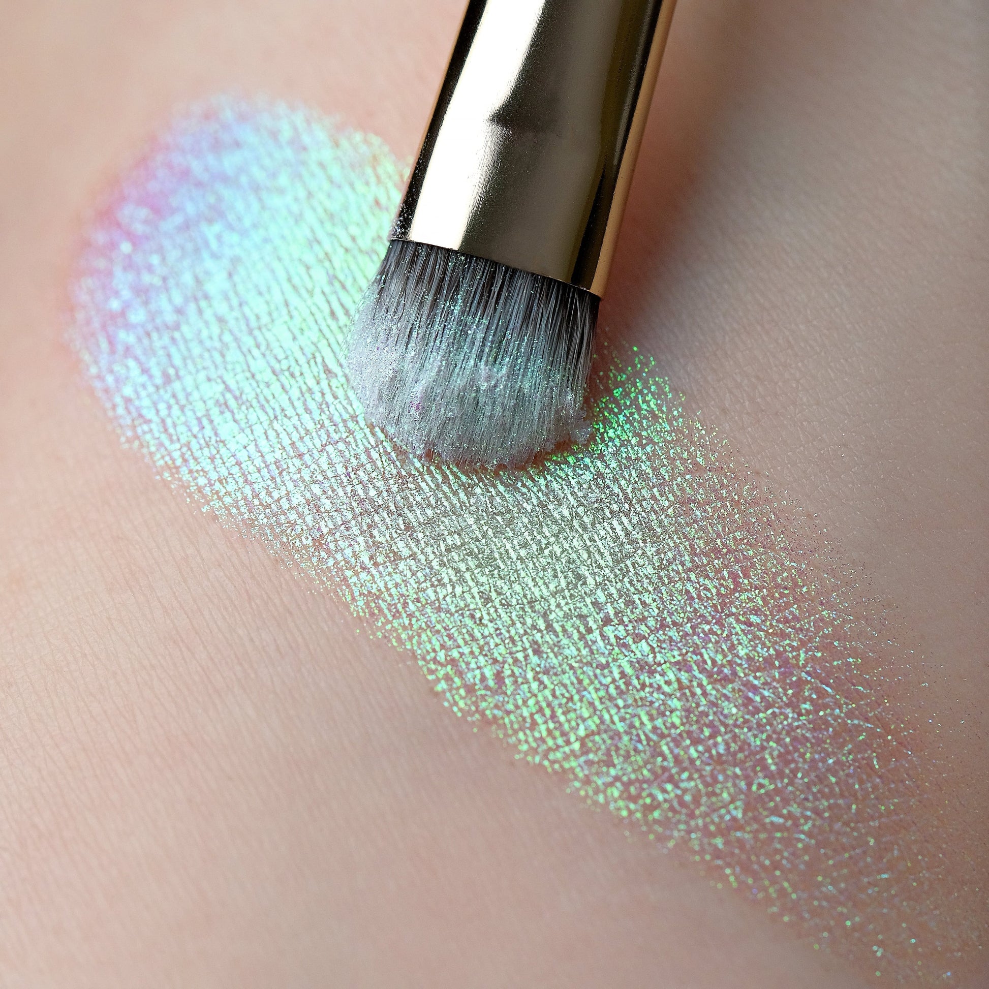 Super-fine loose eyeshadows with a pastel base and a glimmering, colour-changing finish, designed to complement all skin tones. With a body colour of white shimmer and sparkles, they shift spectral colours: green, blue, gold, and purple.