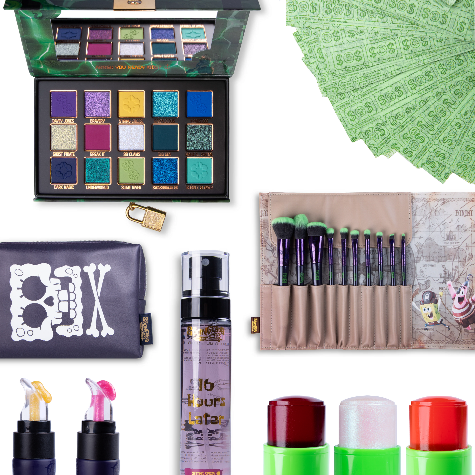 Available individually: The SpongeBob Movie eyeshadow palette, SpongeBob lip gloss, SpongeBob Movie jelly stick, Treasure Map makeup brush set, SpongeBob Skull and Bones makeup bag, 16 Hours Later setting spray, and Mr. Krabs’ Wallet blotting paper.