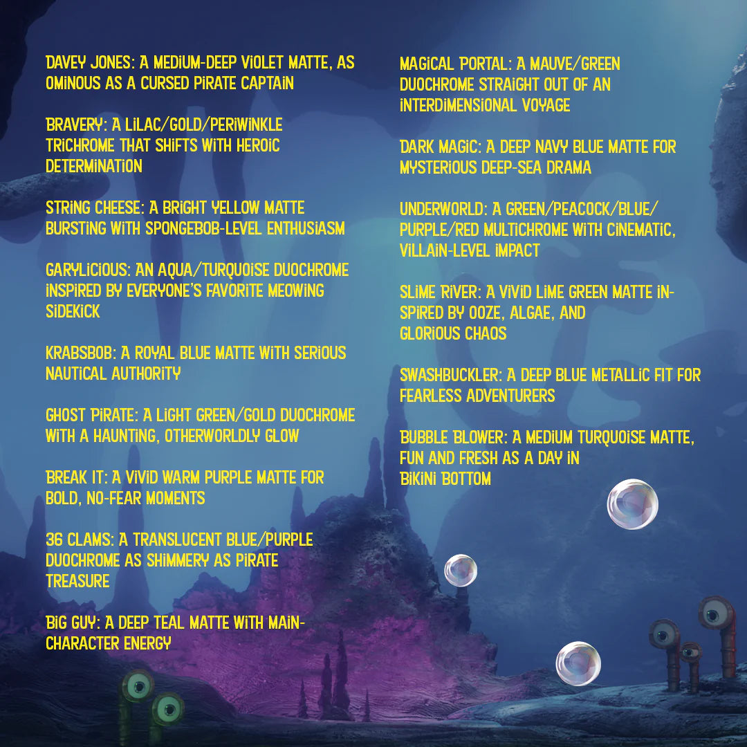 This precious 15-pan treasure is packed with oceanic mattes, magical duochromes, and spellbinding multichromes inspired by the deep sea, ghost pirates, algae blooms, and slime-filled rivers. From SpongeBob’s fearless optimism to the eerie depths of the underworld, it is perfect for looks that range from playful and bright to dark, dramatic, and downright legendary.