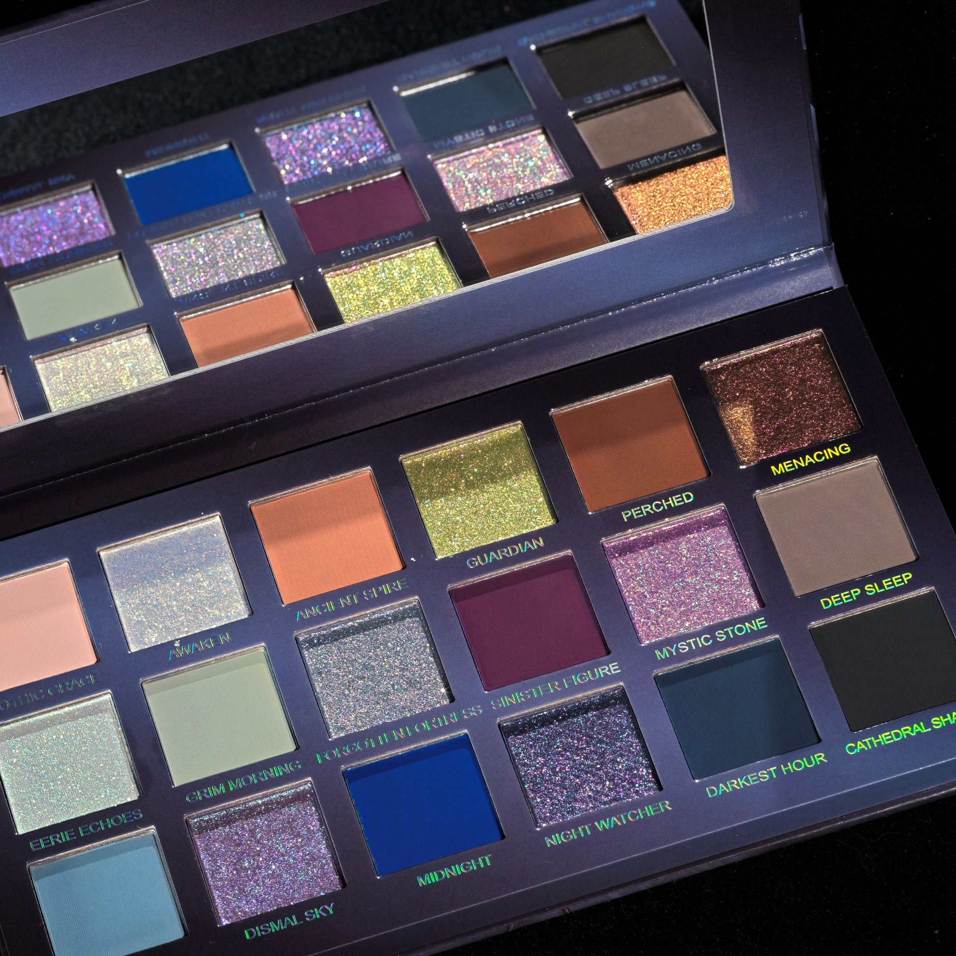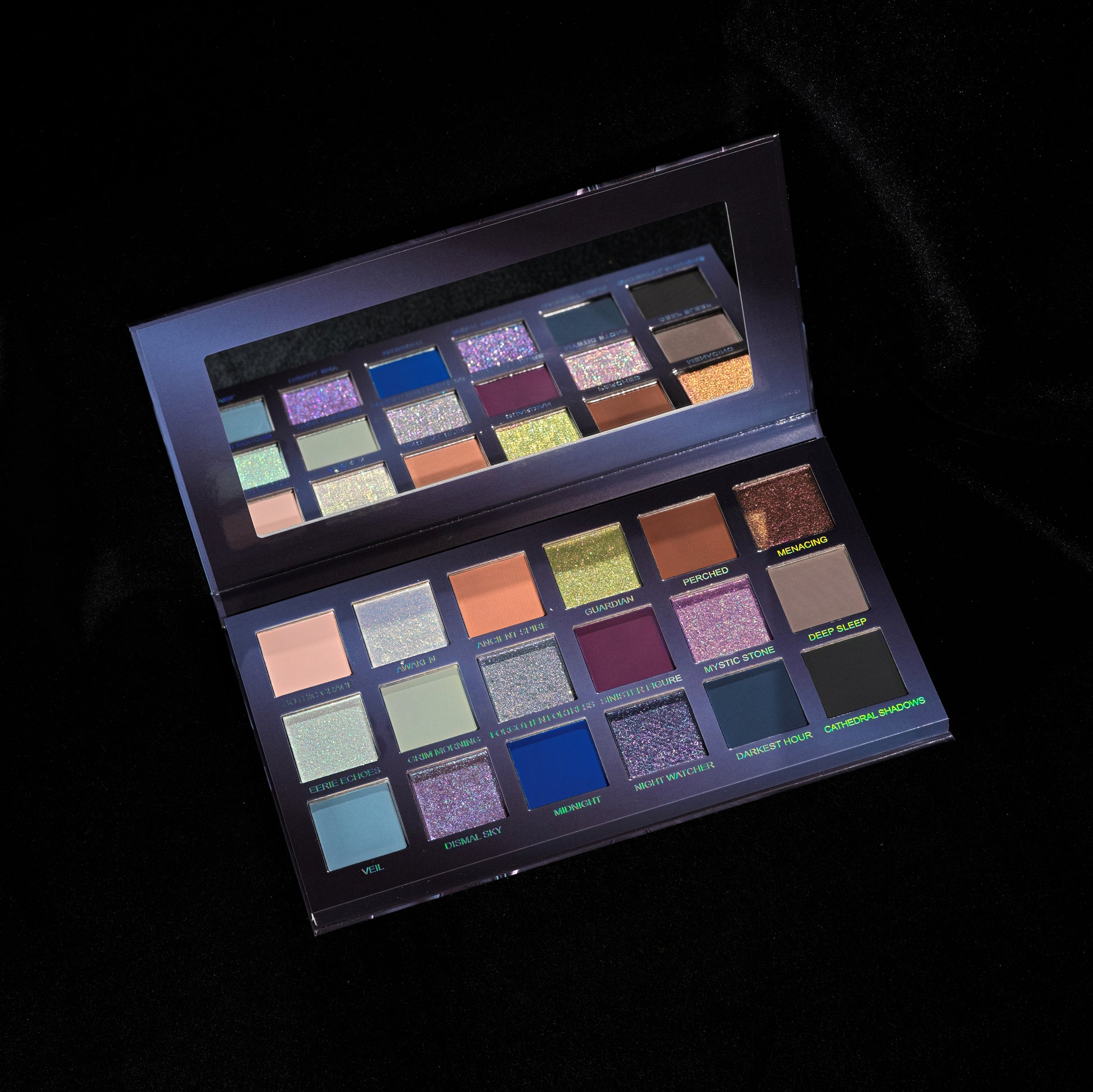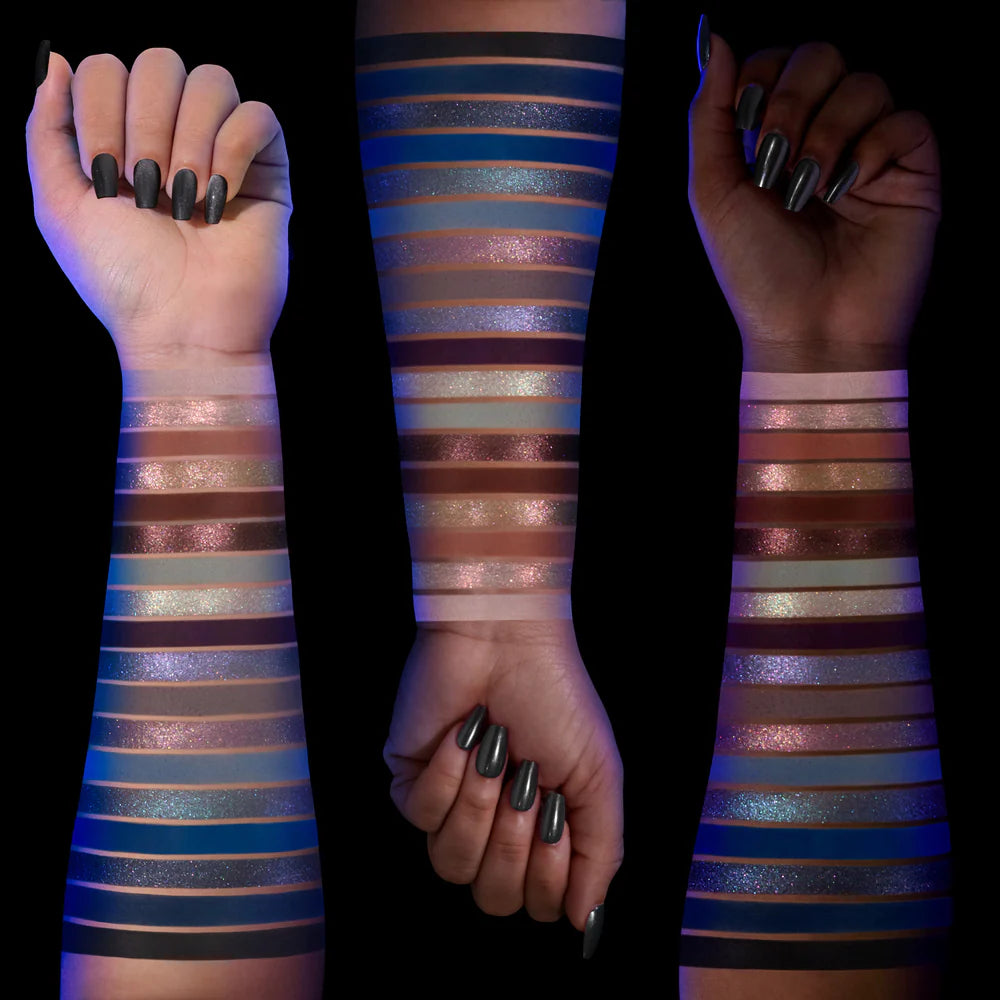 Gothic Grace, Awaken, Ancient Spire, Guardian, Perched, Menacing, Eerie Echoes, Grim Morning, Forgotten Fortress, Deep Sleep, Veil, Midnight, Darkest Hour, Cathedral Shadows: Mica, Talc, Silica, Ethylhexyl Palmitate, Octyldodecanol, Synthetic Fluorphlogopite, Isononyl Isononanoate, Dimethicone, Hydrogenated Polyisobutene, Kaolin, Magnesium Stearate, Calcium Aluminum Borosilicate, Nylon-12, Octyldodecyl Stearoyl Stearate, Polymethyl Methacrylate, Caprylic/Capric Triglyceride, Aluminum Starch Octenylsuccinate, Trimethylsiloxysilicate, Tin Oxide, Phenoxyethanol, Tocopheryl Acetate, Ethylhexylglycerin, Caprylyl Glycol.
